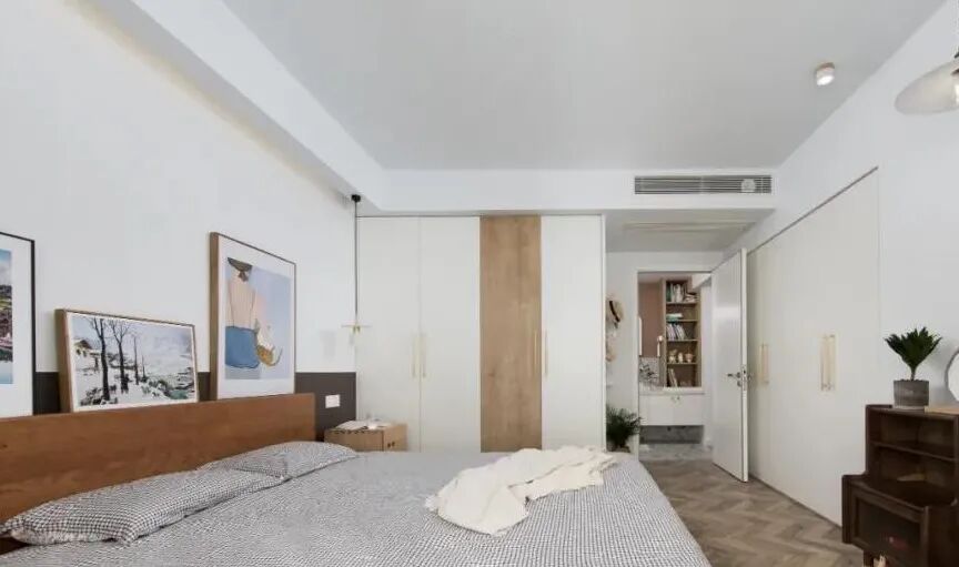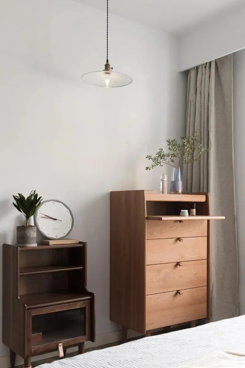 床尾摆放了五斗柜以及其它柜子用以提高利用率的同时,满足日常生活物品的收纳。再有就是对面的衣柜以及过道右侧借用客厅空间增设的柜子。