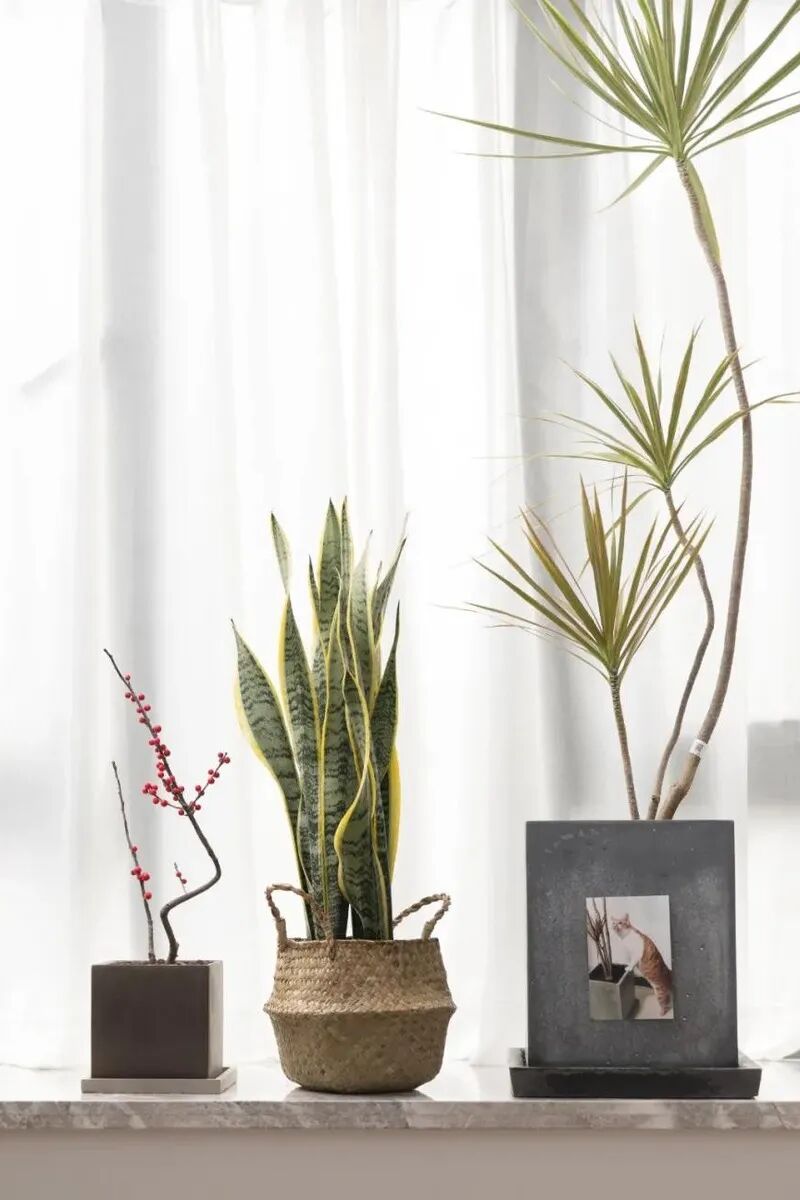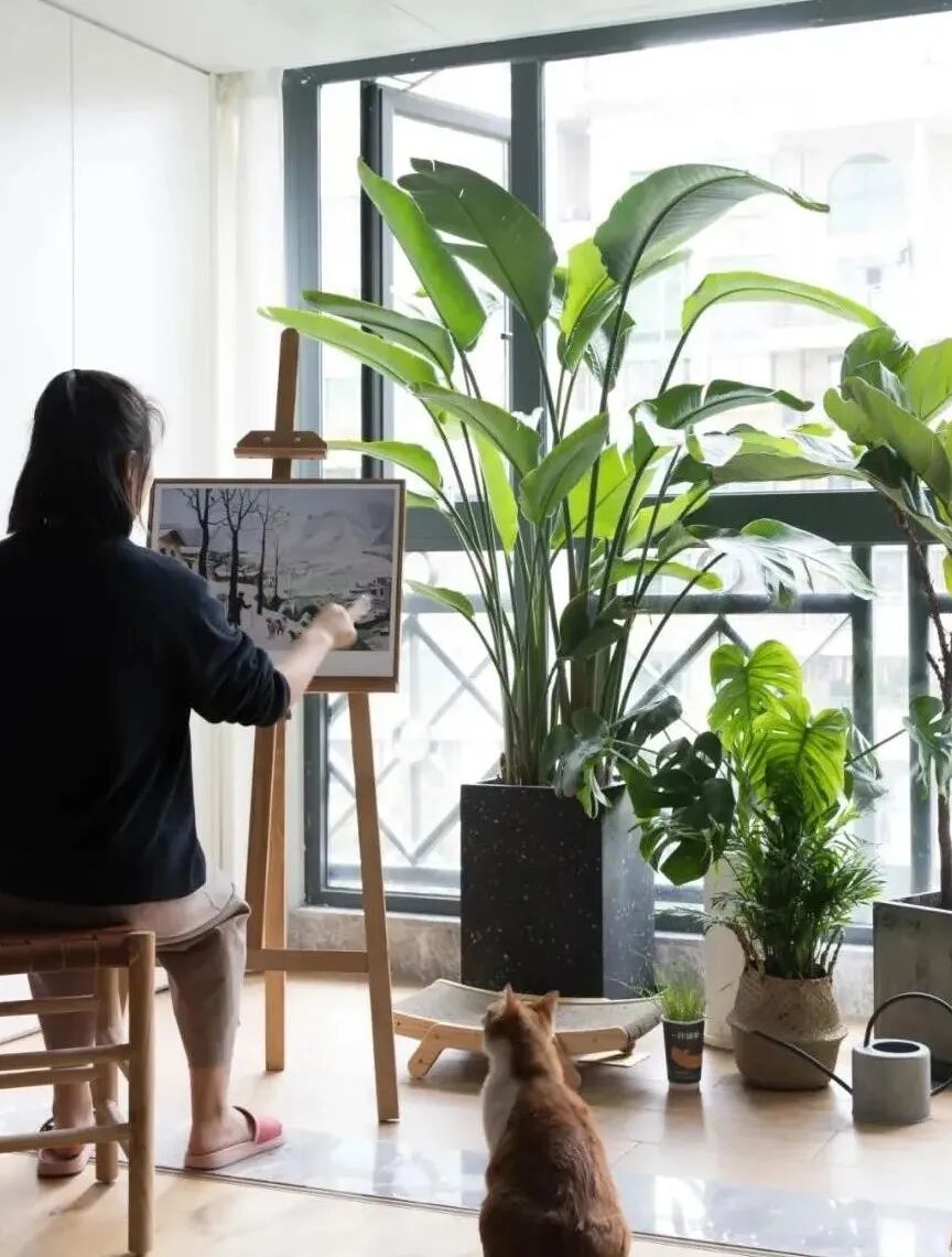 沙发右侧可以看到阳台,配有落地窗以及绿植花卉,如此前者为室内提供了优渥的采光和视野,后者则为家注入了无限的生机与活力。其它就是阳台左侧定制的家政柜以及右侧叠放的洗衣机和烘干机,显然经过以上设计,效果无疑变得更加实用