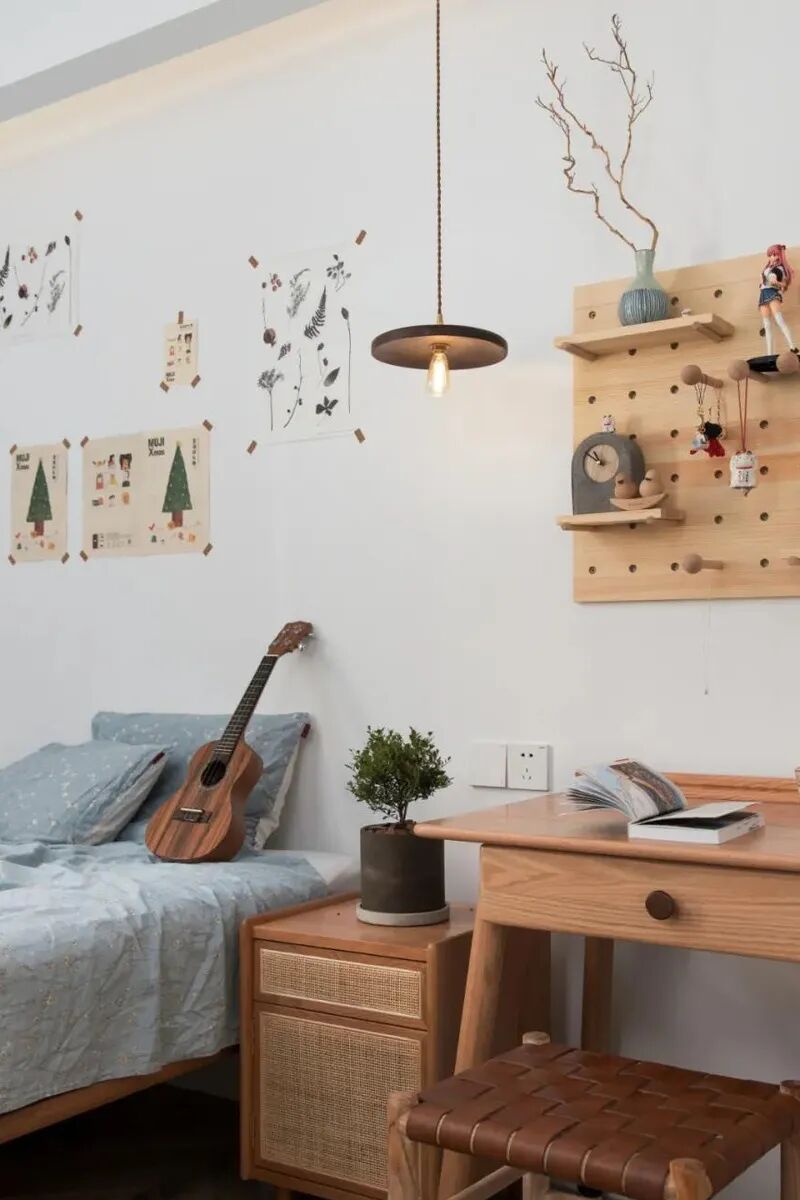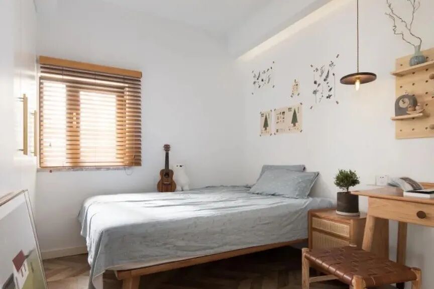 儿童房的空间不大,就直接靠着墙角摆放简约的卧室床,这样就能释放床尾的空间以及右侧的空间分别设有衣柜和用来读书写作业的书桌。