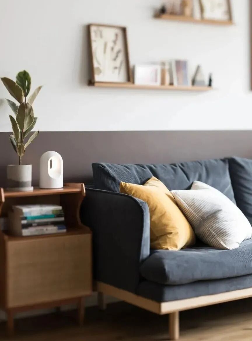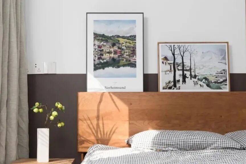 沙发墙为了避免单调,就选用上下不一的两种色调拼接起来,结合装饰画以及置物隔板等等,空间效果一下子就变得丰富了起来。其它就是简约的沙发,下班回到家窝在这放松休闲真的倍感惬意,尤其是在夫妻双方共同的陪伴下,这种日子虽简单,但幸福。