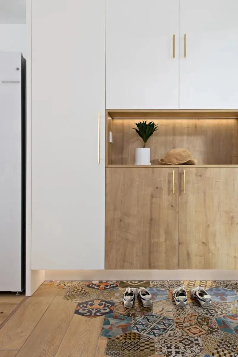 现在看实景。鞋柜利用白色和木色作为对比,视觉效果更丰富。而金色的把手则为空间注入了一丝轻奢的气息,看着更有质感。至于地面的花砖,和地板进行了拼接过渡处理,如此回到家真的有种满满的仪式感。