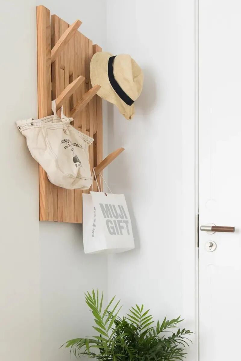 这是主卧门背的空间,背景墙安装了挂钩用来挂放衣帽以及手包等等,显然这样无论是回家还是出门都要更为方便。