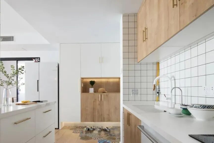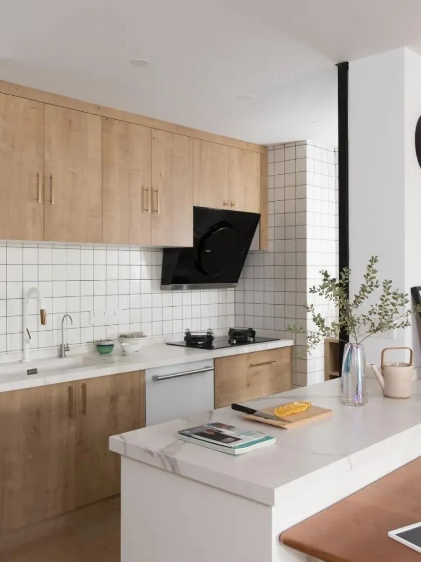 装修本身的话,以小白砖为主,配上温润的木色橱柜,看着很舒服,也很解压。