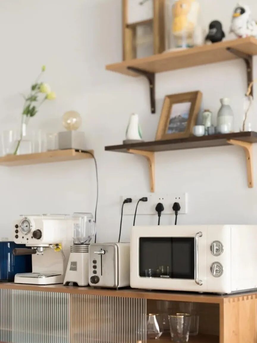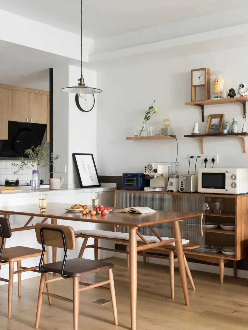 餐厅摆放了结构轻巧的木质餐桌椅,可以让空间显得更为灵活。右侧的话是半高的成品餐柜,台面刚好摆放一些小家电,加上提前预留的插座以及置物隔板等等,细节考虑非常周到