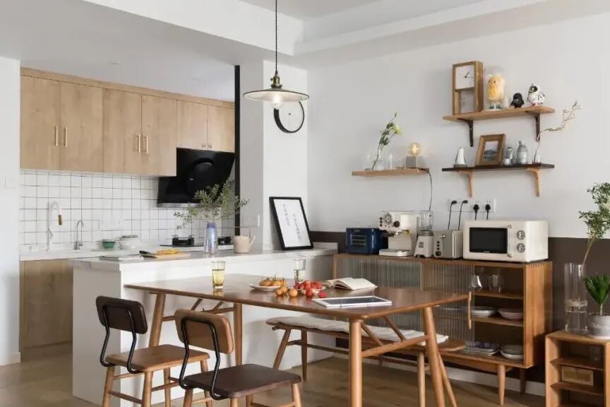 1、打掉厨房与餐厅之间的非承重墙,然后变为开放式结构,从而打造一个充满互动与交流的餐厨空间;