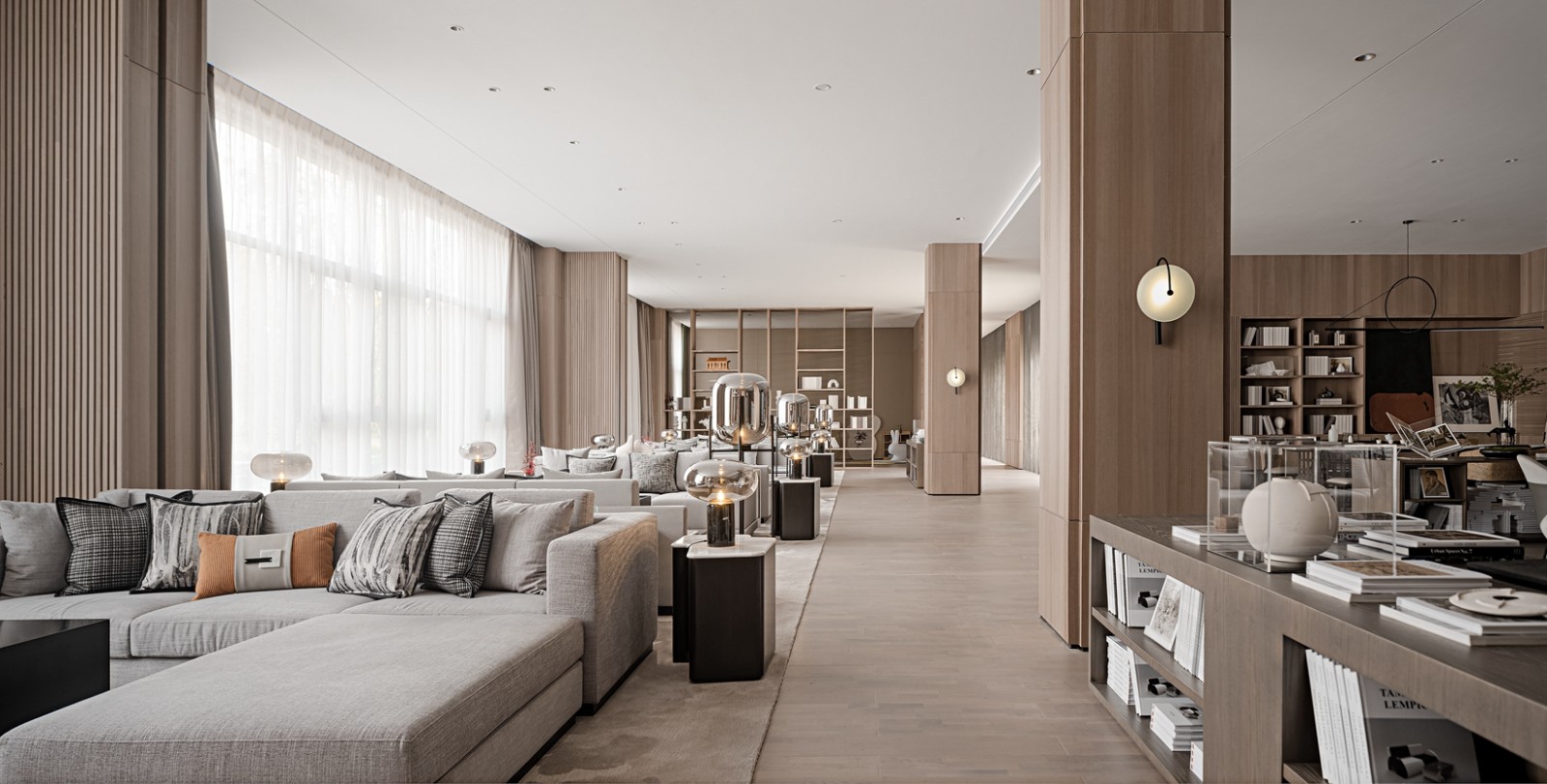 书吧洽谈区以整体的暖色调为主,木色的整体空间营造出轻盈舒适的气氛,而浅灰色的沙发增加了沉重感,深色的配饰座椅则为轻盈的气氛增加了脚踏实地的真实感。